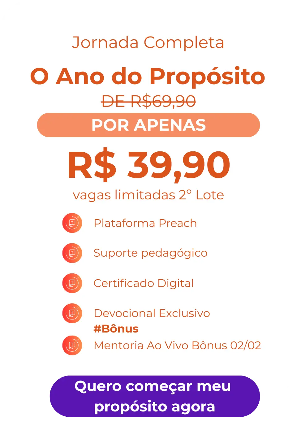 A jornada é composta por aulas ao vivo que serão disponibilizadas posteriormente na plataforma Preach para que você possa rever quando quiser. Além disso, teremos encontros online
